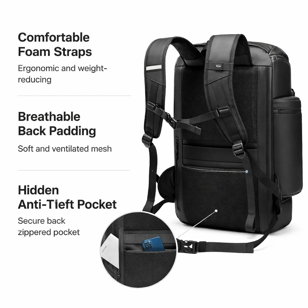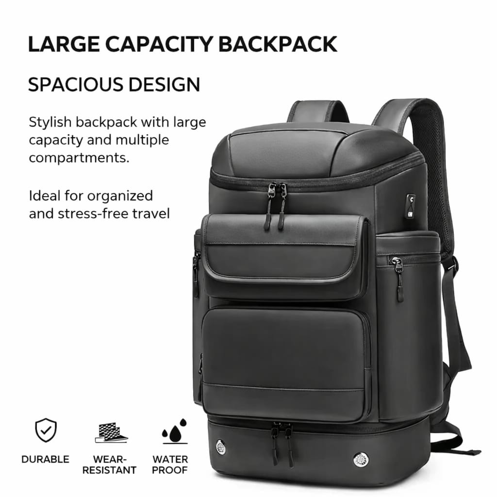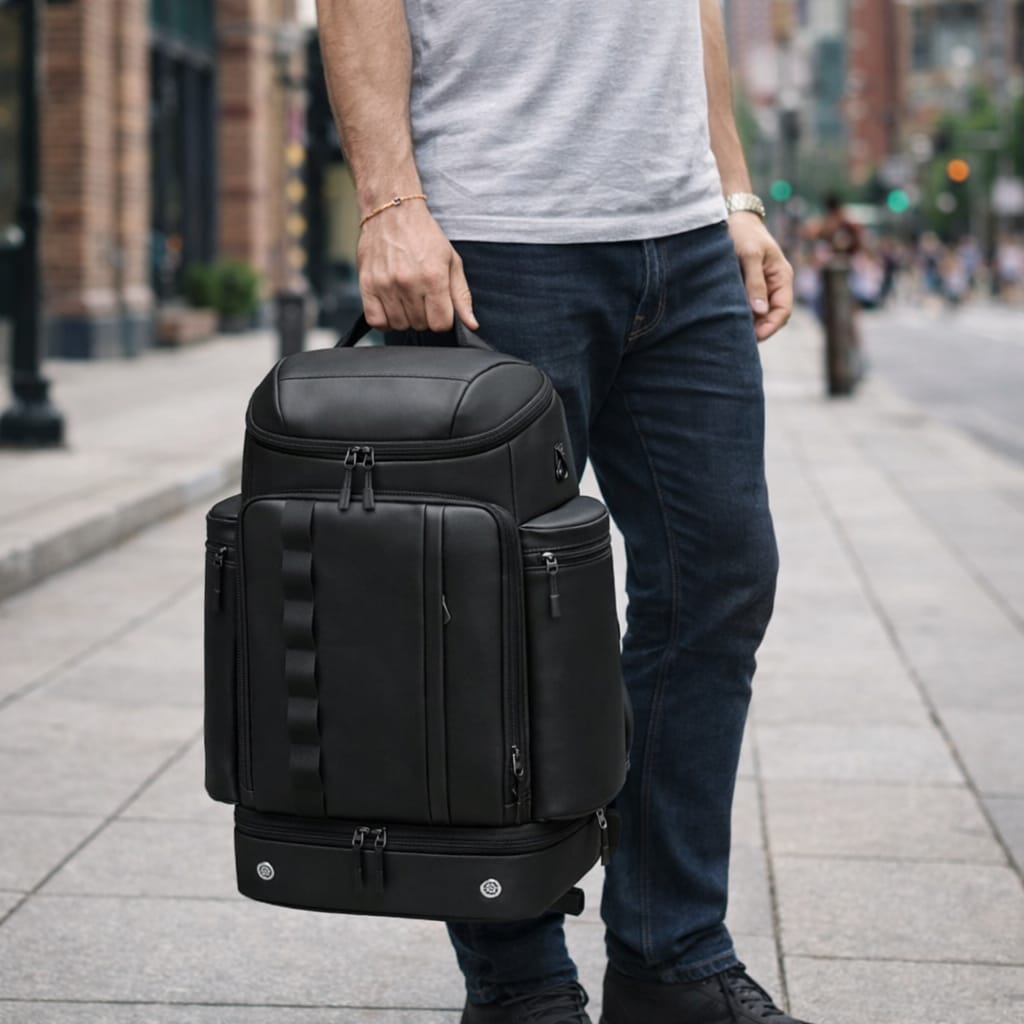 Mochila de viagem masculina com design moderno e funcional, ideal para viagens de negócios, trabalho diário e deslocações urbanas. Combina grande capacidade interna, múltiplos compartimentos bem distribuídos e materiais resistentes para garantir conforto, segurança e durabilidade.
