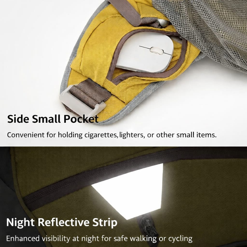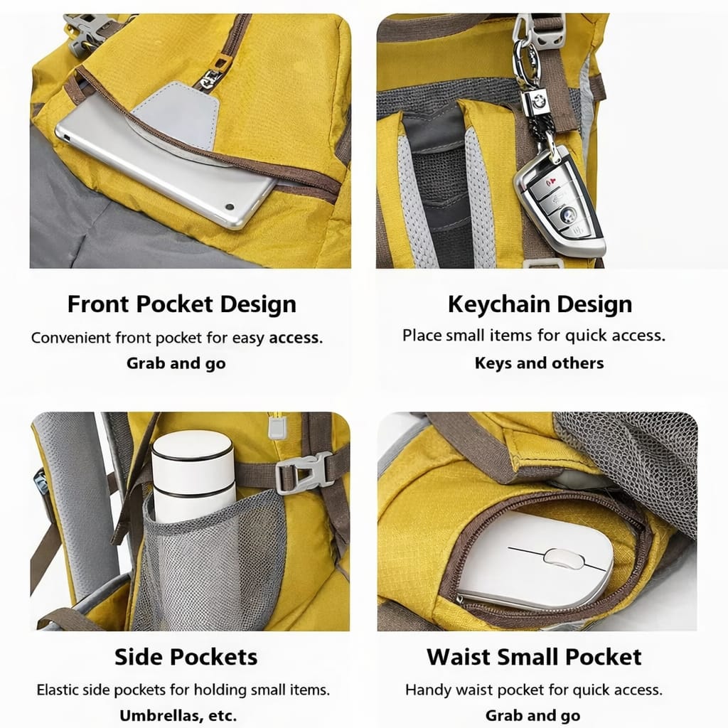 - Compartimentos múltiplos: Bolsos frontais, laterais, cintura e compartimento principal espaçoso.